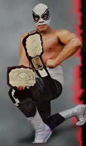 ![]() Azteca pictured with the Mexican National Welterweight and NWA World Middleweight Championships in 1989 | |