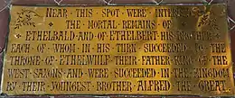 Æthelberht died of unknown causes in the autumn of 865. He was buried at Sherborne Abbey in Dorset beside his brother Æthelbald[36] but the tombs had been lost by the sixteenth century.[37] He had no known children[lower-alpha 5] and was succeeded by his brother Æthelred.[39]