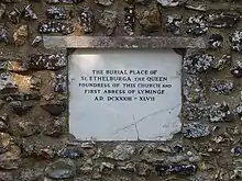 Æthelburh of Kent (born 601,[1] sometimes spelled Æthelburg, Ethelburga, Æthelburga; Old English: Æþelburh, Æðelburh, Æðilburh, also known as Tate or Tata),[2][3] was an early Anglo-Saxon queen consort of Northumbria, the second wife of King Edwin. As she was a Christian from Kent, their marriage triggered the initial phase of the conversion of the pagan north of England to Christianity.