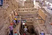 Mellaart was banned from Turkey for his involvement in the Dorak affair in which he published drawings of supposedly important Bronze Age artifacts that later went missing.[10] After this scandal, the site lay idle until 1993, when investigations began under the leadership of Ian Hodder, then at the University of Cambridge.[11][12][13][14][15] These investigations are among the most ambitious excavation projects currently in progress according to archaeologist Colin Renfrew, among others. In addition to extensive use of archaeological science, psychological and artistic interpretations of the symbolism of the wall paintings have been employed. Hodder, a former student of Mellaart, chose the site as the first "real world" test of his then-controversial theory of post-processual archaeology.[16] The site has always had a strong research emphasis upon engagement with digital methodologies, driven by the project's experimental and reflexive methodological framework.[17] Sponsors and collaborators of the current dig include Yapi Kredi, Boeing, University of York, Selçuk University, British Institute at Ankara, Cardiff University, Stanford University, Turkish Cultural Foundation, and University at Buffalo.[18]