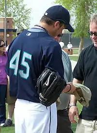 On February 8, 2008, Bédard was traded to the Seattle Mariners in a 5-for-1 deal sending outfielder Adam Jones and pitchers George Sherrill, Tony Butler, Chris Tillman and Kam Mickolio to the Orioles.[15] On February 13, Mariners manager John McLaren announced that he would be their Opening Day starter.[16] Bédard then signed a one-year, 7-million dollar deal with the Mariners on February 15, avoiding salary arbitration.[17] He was 6–4 with a 3.67 ERA in 15 starts for the Mariners in 2008[5] but on July 10, 2008, he was placed on the 15-day disabled list with stiffness in his left shoulder.[18] He missed the rest of the season and underwent arthroscopic surgery on the shoulder on September 26.[6]