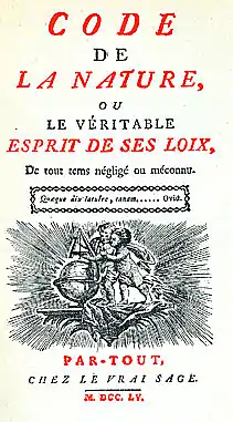 Étienne-Gabriel Morelly (French: [mɔʁɛli]; 1717, Vitry-le-François – 1778) was a French utopian thinker and novelist. An otherwise "obscure tax official",[1] Morelly wrote two books on education and a critique of Montesquieu. As well he is thought to be (perhaps erroneously) the author of The Code of Nature, which was published anonymously in France in 1755. This book, a basis of thought for later socialist and Communist thinkers, criticized the society of his day, promoted a social order without avarice and proposed a constitution intended to lead to an egalitarian society without property, marriage, church or police.[2]
