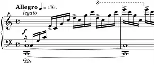 = 176 "the majestic grandeur [would be] impaired."[4] There is no Maestoso indication by Chopin though. Unlike Op. 10, No. 4, which reaches fff, this one stays in f throughout and never once reaches ff. Both right hand arpeggios and left hand octaves are to be played legato throughout.