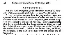 - John Caverhill, "Some Attempts to ascertain the utmost Extent of the Knowledge of the Ancients in the East Indies", Philosophical Transactions, vol.57, 1767, pp. 155–174.