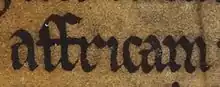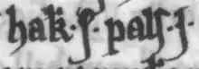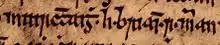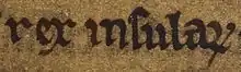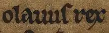 ![]() Óláfr's name and title as it appears on folio 35v. of British Library Cotton Julius A VII (the Chronicle of Mann): "Olavus rex".[1] | |