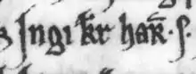 Besides his wife Affraic, the chronicle states that Óláfr had many concubines by whom he had several daughters—including the daughter married to Somairle—and three sons: Rǫgnvaldr, Lǫgmaðr, and Haraldr.[153][note 13] The B-text of the thirteenth-century Fagrskinna records that Óláfr married Ingibjǫrg, daughter of Hákon Pálsson, Earl of Orkney.[155] Whilst Ingibjǫrg is not referred to by the chronicle,[156] she is certainly linked to Óláfr by Orkneyinga saga,[157] although this source also incorrectly states—in a passage concerning Guðrøðr's son and successor, Rǫgnvaldr—that Ingibjǫrg was Guðrøðr's mother.[158] As a consequence of this error, there is reason to suspect that the saga has conflated Guðrøðr's son with Somairle's like-named son, Ragnall. The saga's confused entry, therefore, may be evidence that Ingibjǫrg was the mother of Óláfr's daughter, Ragnhildr.[159] The terminology employed by the sources documenting Affraic and Ingibjǫrg reveal that the latter's relationship with Óláfr came to be viewed differently in Orkney than the Isles.[160] Although Orkneyinga saga acknowledges that the union between Ingibjǫrg's own parents was not a canonical marriage either, the coupling formed the basis for her family's claim to the earldom.[161][note 14] Whatever the case, Óláfr's union with Ingibjǫrg likely predates his marriage to Affraic.[165] Accordingly, Óláfr appears to have turned from an alliance with Ingibjǫrg's brother and Norwegian dependant, Páll Hákonarson, Earl of Orkney, to establish an alliance with Fergus, who was then a rising power in the Irish Sea region. The end result of this shift may be alluded to by the chronicle which states that Óláfr held peaceful alliances with Irish and Scottish kings so that none "dared disturbed" the Kingdom of the Isles.[166]