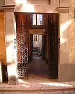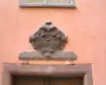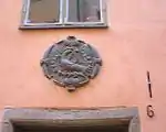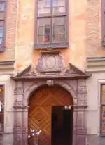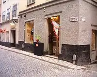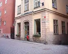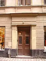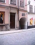 On either side of Number 37 are Lilla Hoparegränd ("Smaller Heaper's Alley", a corruption of "Hoper's Alley", e.g. hooper indicating a profession, 'maker of barrels') and Pelikansgränd ("Pelican's Alley"), both forking off from Gaffelgränd ("Fork alley"). While the building is standing on a medieval wall, the façade is from the 18th century, and the portal from the 17th century. The latter was probably cut by Johan Wendelstam, a German sculptor who arrived to Stockholm in 1641 to become the Guild Master within a few years, and also cut one of the portals on Stortorget. The client was apparently Dutch as the inscription on the gable stone reads: Gaet het wel men heeft veel vrinden kert het luck wie kan se vinden ("When luck stands by one have a lot of friends, but when luck turns where are they then?"). Behind the front door is an entrance hall featuring a richly profiled sandstone column carrying a cross-vault.[5][26] The façade of Number 24 dates back to 1862, the shutters and wooden panels from that time however replaced by the rough-cast plaster probably in 1945, and the windows enlarged since.[27] The rusticated façade of Number 26 dates back to the enlargement in 1846, at the time it was however perfectly symmetric, a balance manipulated in 1973 when the enlarged opening and wooden panel of the restaurant entrance was added. The northern door, still featuring some original details, gives a fair impression of what the façade looked like in the 19th century.[28] The façade of Number 28, arguably one of the oldest still existent residential properties in Stockholm, is mostly from 1874 with some details replaced in 1969.[29]
