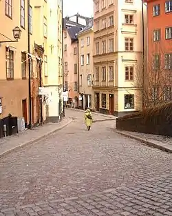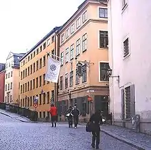 Like Västerlånggatan, Österlånggatan used to pass outside of the city walls and was for many centuries one of the city's major streets. (See Västerlånggatan for more details.) When Skeppsbron, the broad street and quay running to the east of Österlånggatan, was created during the 17th century, Österlånggatan lost much of the importance it used to have.[1] Compared to Västerlånggatan, Österlånggatan is today a relatively quiet street notwithstanding the many restaurants and shops, in sharp contrast to the neighbourhood when the street formed the backyard of the dock district, crowded with sailors, taverns, travellers, and traders.[2]