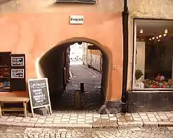 The alley Kråkgränd, named after the magistrate Knut Nilsson Kråka who lived there in the early 17th century. The alley have also been named after the magistrate Johan Persson who in 1638 took over a property said to be located "on the upper corner in a vault over the alley".[9] Under the first five small building behind Number 15 are the merged medieval cellars of the restaurant Fem Små Hus ("Five Small Houses") started in 1969. The basement of the block have, however, served as a tavern for several hundreds years – two illegal inns were reported in 1694.[10][11]