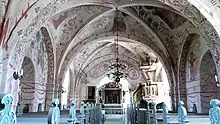 The murals mainly, but not exclusively, depict religious subjects. The paintings on the westernmost bay of the nave displays the story of the Last Judgment, while the rest of the nave shows depictions of saints; among these the three Nordic royal saints Olaf, Canute and Eric. On and close to the wall separating the choir from the nave are a number of depictions of prophets as well as Christ and Mary, while the side facing the choir depicts the fall of man.[1]
