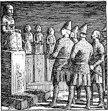 Irpa appears in chapter 21 of the Jómsvíkinga saga, which focuses on the late 10th century Battle of Hjörungavágr between the fleet of the Jomsvikings under Sigvaldi Strut-Haraldsson and the fleet of Haakon Sigurdsson and Sweyn Haakonsson. Haakon calls a meeting during a lull in the fighting, and says that he feels that the tide of the battle is going against his allies and him. Haakon then goes to an island called Primsigned, north of Hjórunga Bay.[7] On the island, Haakon falls to his knees, and, while looking northward, prays to what is described as his patron goddess, Þorgerðr Hölgabrúðr. According to the saga, Þorgerðr repeatedly refuses his offers, but finally accepts the blót of his 7-year-old son. Haakon's slave, Skopti, slaughters the boy.[8] Haakon returns to his fleet and presses his men to engage in an attack, and commends his men to ("Þorgerðr" is here anglicized as "Thorgerd"):