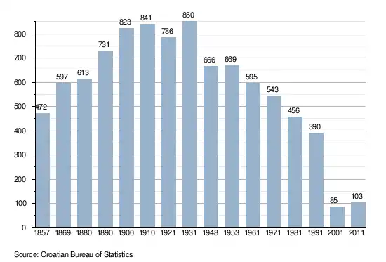 According to the 1991 census,[3] 92.56% of the village population were ethnic Serbs (361/390), 6.41% were ethnic Croats (25/390), 0.77% were Yugoslavs (3/390), while 0.26% were of other ethnic origin (1/390).