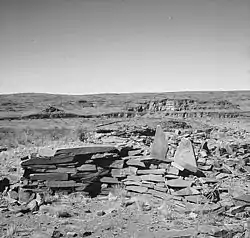 The site named ǁKhauxaǃnas refers to the fortified settlement atop the hill overlooking the Bak River. It consists of a trapezium-shaped walled-in enclosure of approximately 150 by 350 meters, and contains several ruins of buildings and kraals. Most of the dwellings are situated near the perimeter wall, which contains 23 doorways.[2] The settlement directly adjacent to the west is the Veldschoendragers Schans Vlakte village that was described by 19th century missionaries. It is equally uninhabited today and contains the ruins of a church that was designed to accommodate 300 people. While the fortification was built by piling sandstone slabs and fitting them together, for the church walls mortar was used.[3]