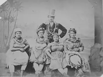 ʻIoane was also renowned for his manner of dress and he was often seen on the streets of Honolulu with a velvet suit, jackets and slacks, white gloves, a cane, monocle and either a high silk hat or a beaver skin hat. Local English newspapers dubbed him the Hawaiian Dandy or the Hawaiian Beau Brummel.[14] He was often mistaken for a prince by visiting foreigners.[15][16] Lacking the financial means to purchase his fashionable wardrobe, he personally designed his own clothing, which his wife helped make, from donations made to him by his patrons and admirers. His image was later featured on a local brand of smoking tobacco.[3][17] Anthropologist Jane Desmond noted that ʻIoane's appearance and manner of dress in photographs "unusual, when compared with tourist representations, as an image of an obviously successful Native Hawaiian male."[18]