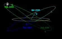 The adjacent diagrams show polar and ecliptic views of the orbits of the two cubewanos. The perihelia (q) and the aphelia (Q) are marked with the dates of passage. The present positions (as of April 2006) are marked with the spheres, illustrating relative sizes and differences in albedo (both objects appear neutral in the visible spectrum).