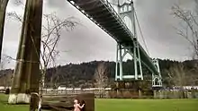 Permanent outdoor exhibit of a metal river at Cathedral Park, under the St. John's Bridge in Portland Oregon, installed with music box tune of Hoagy Carmichael's "Up A Lazy River", the year the bridge was dedicated.