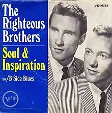 "(You're My) Soul and Inspiration" is a song by American pop duo the Righteous Brothers. It was the group's first hit after leaving their long-time producer Phil Spector. The song was written by Barry Mann and Cynthia Weil, who also wrote the group's first hit "You've Lost That Lovin' Feelin'" along with Phil Spector. It is the title track of their album.[1] The single peaked at No. 1 on the US Billboard Hot 100, and reached No. 15 on the UK Singles Chart. Billboard ranked the record as the No. 3 single for 1966.[2]
