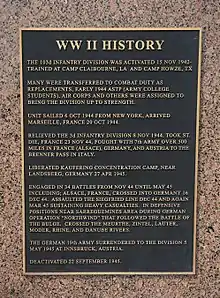 As German resistance disintegrated, the 103rd reached the Upper Rhine Valley, 23 March, and engaged in mopping up operations in the plain west of the River Rhine. In April 1945, it received occupational duties until 20 April when it resumed the offensive, pursuing a fleeing enemy through Stuttgart and taking Münsingen on 24 April. On 27 April, elements of the division entered Landsberg, where Kaufering concentration camp, a subcamp of Dachau, was liberated.[4][5] The men of the division crossed the Danube River near Ulm on 26 April. On 3 May 1945, members of its 409th Infantry Regiment captured Innsbruck, Austria with little to no fighting. The 411th Infantry Regiment continued on to take the Brenner Pass and earn the honor of linking up with the 88th Infantry Division of the Fifth Army, which had been fighting its way north up the Italian peninsula. Troops met at Vipiteno, Italy, near the Austrian border, on 4 May 1945, joining the Italian and Western European fronts.[2]