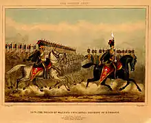 In 1813, having landed once more in Spain, the regiment fought at the Battle of Morales in June 1813.[15] During the battle the regiment destroyed the 16th French Dragoons between Toro and Zamora, taking around 260 prisoners.[16] The regiment also fought at the Battle of Vitoria later in the month while still in Spain[17] and then, having advanced into France, fought at the Battle of Orthez in February 1814[18] and the Battle of Toulouse in April 1814.[19] As part of the 6th Cavalry Brigade, the regiment charged the French cavalry and infantry at the Battle of Waterloo in June 1815.[20]
