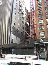 The developers broke ground on the project in early 2014.[95] During that July, the developers installed the tallest freestanding crane in New York City history, which measured 220 feet (67 m), to construct the residential tower.[96] In January 2015, the New York City Department of Buildings approved final permits for the project.[30][97] The new permits called for the tower to rise 80 stories, with a 1,397-foot (426 m) roof and a 24-foot (7.3 m) crown bringing its pinnacle to 1,421 feet (433 m).[81][98][99] At the time, the tower was to contain 55 luxury condominiums and would be finished in 2017.[97] Due to technicalities in building codes, the new tower was classified as an alteration of the existing Steinway Hall, which was also addressed as 111 West 57th Street.[100] The tower's proposed height was slightly increased in March 2015 to 1,428 feet (435 m).[101]