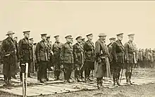 On 23 October, the 2nd Battalion attacked towards Hill 361 with the 115th's 1st Battalion and the 113th's 1st Battalion. The battalion advanced in the center after an artillery barrage and stopped at 1430 after reaching Hill 361. The 1st and 3rd Battalions of the 116th then moved into the line. On the night of 28 to 29 October, the regiment was relieved by the 79th Infantry Division's 316th Infantry Regiment. From 23 October, the regiment had suffered casualties of 161 wounded, 15 died of wounds, and 46 killed. Total casualties of the regiment in the offensive were thus 1,005 wounded, 59 died of wounds, and 198 killed.[26] During the offensive, the regiment captured 2,000 German prisoners, 250 machine guns, and 29 high-caliber guns.[27] The regiment moved with the division to Vavincourt. The war ended on 11 November, and the regiment and the division moved to the 11th (Bourbonne-les-Bains) Training Area. For the next several months the regiment conducted training.[18] Kelley was relieved after being gassed on 4 December and replaced by Colonel George W. Ball.[28] The regiment was reviewed as part of a ceremony where American personnel were decorated by Field Marshal Sir Douglas Haig, Commander-in-Chief (C-in-C) of the British Expeditionary Force (BEF), on 4 April 1919 at Chaumont.[29] On 11 April the regiment moved with the division to the Ballon area of the Le Mans American Embarkation Center. Ten days later, it was transferred to Saint-Nazaire.[30] On 10 May, the regiment embarked for the United States on the USS Matsonia. After returning to Newport News on 21 May, the regiment was demobilized on 30 May 1919 at Camp Lee.[1][31]