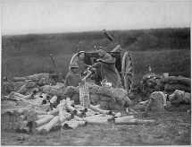 The place in the front line where the 79th Infantry Division was set to make its attack was in the same area where a half million soldiers from the French and German Armies had perished in the Battle of Verdun in 1916.[24] At 23:30, on 25 September 1918, the 119th Field Artillery commenced harassing and interdiction fire at the German front lines.[65] At 2:30, on 26 September 1918, the 119th Field Artillery participated in a three-hour artillery barrage of German positions in preparation for the initial infantry assault.[66] At 5:30, under the protection of a rolling barrage from the 119th Field Artillery, the 79th Infantry Division attacked and advanced toward the village of Montfaucon.[67][65] The advance of the 79th Infantry Division was hindered by machine-gun fire during the entire afternoon stalling their advance. The resistance by the Germans in the vicinity of Montfaucon was so deadly that the 79th Infantry Division had to wait for the 119th Field Artillery before they could advance further. The guns of the 119th Field Artillery were delayed in advancing due to the poor conditions of the roads over an area that used to be "No Man's Land" and the congestion on those roads that could be utilized.[68][24] By the end of the day the 79th Infantry Division had captured the villages of Haucourt and Malancourt and reached a line one—half kilometer (just over 1/4-mile) north of Malancourt and along the northeastern edge of the Bois de Cuisy (Cuisy Woods).[67]