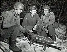 The United States declared war on Germany on 11 December 1941 four days after the Japanese attack on Pearl Harbor and on the same day that Germany declared war on the United States.[91][92] Colonel Lloyd M. Hanna was appointed the new commander of the 119th Field Artillery on 16 February 1942.[7] In 1943, the United States Army decided to restructure the non-divisional field artillery to increase their flexibility and response times during combat.[93] The 119th Field Artillery had been a non-divisional field artillery unit since they were separated from the 32nd Infantry Division on 18 September 1940. The regiment was broken up on 8 February 1943, and its elements were reorganized and redesignated. The old Headquarters and Headquarters Battery was renamed to Headquarters and Headquarters Battery, 119th Field Artillery Group. The 1st Battalion was renamed the 978th Field Artillery Battalion. The 2nd Battalion was renamed the 979th Field Artillery Battalion.[1]