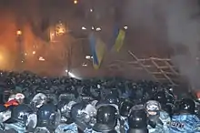 At 1:33 a.m. Andriy Shevchenko informed the protesters that Berkut forces were going to break the barricades from the side of Mykhailivska Square.[7][8] Violent fights occurred in the Square as the Berkut started destroying the barricade on Instytutska Street, and Titushky started plundering the camp. Although the government concentrated a large number of security forces around the square, protesters did not give up and their number eventually grew. Berkut used tear gas on the protesters and the clouds of the smoke were visible over the crowd as reports about arrested and injured people, including MPs, were being aired in the news. Calls for mass mobilization of Kyiv citizens to the Maidan were spread and many people responded to the call.[9]
