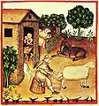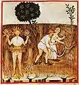 Images from a 14th-century manuscript of Tacuinum Sanitatis, a treatise on healthful living, show the clothing of working people: men wear short or knee-length tunics and thick shoes, and women wear knotted kerchiefs and dresses with aprons. For hot summer work, men wear shirts and braies and women wear chemises. Women tuck their dresses up when working.