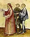 - Older man (chiding an indiscreet young woman, see image below) wears a long, loose houppelande. The fashionable young men wear short tunics, one with dagged edges. The man on the right wears shoes with long pointed toes, late 14th century.
