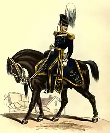 The regiment formed part of Beresford's Allied-Spanish Army at the Battle of Albuera on 16 May 1811.[15] The French army, commanded by Marshal Jean-de-Dieu Soult, Duc de Dalmatie, was attempting to relieve the French garrison of the border fortress of Badajoz. Only after bloody and fierce fighting, and the steadfastness of the British infantry, did the allies carry the day. The regiment, which was unbrigaded, formed part of the cavalry force commanded initially by Brigadier Robert Ballard Long and, later in the battle, by Major General Sir William Lumley.[16]