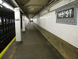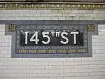 The decorative scheme consists of blue tile tablets; blue tile bands; a white terracotta cornice; and light blue terracotta plaques. The decorative work was performed by tile contractor Manhattan Glass Tile Company and terracotta contractor Atlantic Terra Cotta Company.[32]:40 The platforms contain their original trim line of green with gray borders. "145" in white lettering on a dark border are tiled onto the trim. The station's other name tablets show "145TH ST." in a multi-color mosaic. The directional signs read also read "145TH ST." in white lettering on a black border.