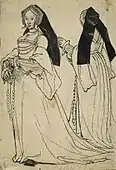 In France, England, and the Low Countries, black hoods with veils at the back were worn over linen undercaps that allowed the front hair (parted in the middle) to show. These hoods became more complex and structured over time.