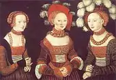 - Three ladies in German fashion of 1525–30. Baretts with upturned slashed brims are worn over cauls, and sleeves are variously puffed, pieced, and slashed, with short wide cuffs extending over the hands.