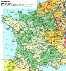 Arriving aboard infected sailors from Sicily, influenza struck the Kingdom of France through the ports of Marseille and Nice and spread through the international crowds of the shipyards. Merchants, pilgrims, and other travelers from the south and east spread the virus throughout the western Mediterranean in July.[26] It was referred to as "cephalie catarrhal" among French physicians, but more commonly just called coqueluche.[1][13][27][7][28][29] Historian François Eudes de Mézeray traced the etymology of "coqueluche" to an outbreak 1410s[30] during which sufferers wore hoods resembling coqueluchons, a kind of monk's cowl.[31] French surgeon Ambroise Paré described the outbreak as having been a "rheumatic affliction of the head...with constriction of the heart and lungs."[1] By August it had appeared in Tours and after it had propagated itself throughout France over summer, sickening the entire country by September.[30] French poet and historian Jean Bouchet, employed by King Louis XII's Royal Court, wrote that the epidemic "appeared in the entire Kingdom of France, as much in the towns as in the countryside."[1]