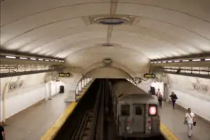 168th Street on the IRT Broadway–Seventh Avenue Line has two tracks and two side platforms,[63][13]:3 and is served by the 1 train at all times.[64] The station was added to the National Register of Historic Places in 2005.[13]