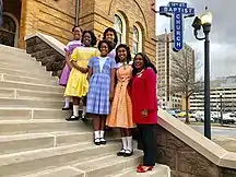 Four girls, Addie Mae Collins (age 14, born April 18, 1949); Carol Denise McNair (age 11, born November 17, 1951); Carole Rosanond Robertson (age 14, born April 24, 1949); and Cynthia Dionne Wesley (age 14, born April 30, 1949), were killed in the attack.[24] The explosion was so intense that one of the girls' bodies was decapitated and so badly mutilated that her body could be identified only through her clothing and a ring.[25] Another victim was killed by a piece of mortar embedded in her skull.[26] The pastor of the church, the Reverend John Cross, recollected in 2001 that the girls' bodies were found "stacked on top of each other, clung together".[27] All four girls were pronounced dead on arrival at the Hillman Emergency Clinic.[28]