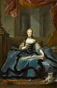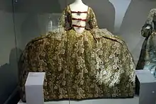 Court dress, the grand habit de cour or "stiff-bodied" gown, retained the styles of the 1670s. It featured a low, oval neckline that bared the shoulders, and the heavily boned bodice laced closed in back, unlike the front-opening robe. The elbow-length sleeves were covered with tiers of lace flounces, echoing the full-sleeved chemise worn with the original style.[11]