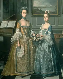 English style was defined by simple practical garments, made of inexpensive and durable fabrics, catering to a leisurely outdoor lifestyle.[2] These lifestyles were also portrayed through the differences in portraiture. The French preferred indoor scenes where they could demonstrate their affinity for luxury in dress and lifestyle. The English, on the other hand, were more "egalitarian" in tastes, thus their portraits tended to depict the sitter in outdoor scenes and pastoral attire.[3]