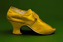 Shoes had high, curved heels—the origin of modern "louis heels"—and were made of fabric or leather, with separate shoe buckles.[14] These were either shiny metal, usually in silver—sometimes with the metal cut into false stones in the Paris style—or with paste stones, although there were other types.