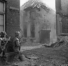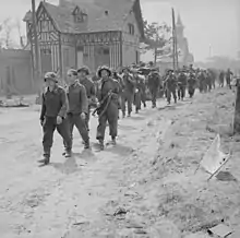 The Brigade was formed on 1 September 1942 by redesignation of 204th Independent Infantry Brigade (Home), a static Home Defence formation serving under Durham and North Riding Area HQ.[1][2] It was assigned frontline infantry battalions and became the infantry component of the new 79th Armoured Division.[1][3] When 79th Armoured was reorganised as a specialist armour formation in April 1943, 185th Brigade transferred to the 3rd Infantry Division, training for Operation Overlord.[1][4] The 3rd Infantry Division was the first British formation to land at Sword on D-Day. During the often intense fighting from Sword to Bremen, the 3rd Infantry Division suffered 2,586 killed with over 12,500 wounded or missing.[5] Throughout the North West Europe Campaign, two members of the brigade (and division) were awarded the Victoria Cross. They were Corporal Sidney Bates of the 1st Battalion, Royal Norfolk Regiment and Private James Stokes of the 2nd Battalion, King's Shropshire Light Infantry.