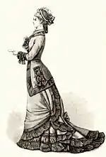 - Dress of 1874 with draped overskirt and ruffled underskirt.