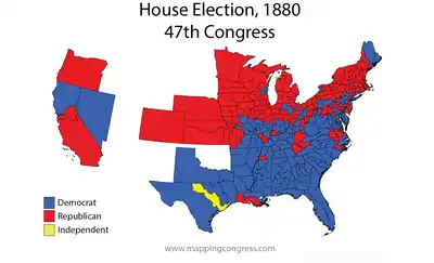 | 1880 House of Representatives election results on election day. (The results in the black-majority SC-5 and MS-6 were contested and later awarded to Robert Smalls and John R. Lynch by the Republican-majority House.[4])