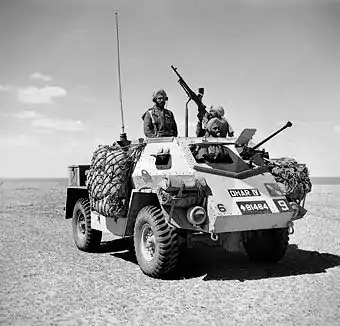 The brigade was detached from the division, and dispatched to Egypt along with its units including the 18th King Edward's Own Cavalry. The regiment then served in the Western Desert campaign. The regiment, and the brigade, were attached to a number of different formations that included the 2nd Armoured Division, the 7th Armoured Division, and the 9th Australian Division who they were with during the Siege of Tobruk.[5] The regiment also supplied men for the Indian Long Range Squadron. The brigade was later overrun by the Italians during the Battle of Gazala, and took some days to reform. After the brigade reformed, the regiment was equipped as follows: Cavalry Carrier - 2 x Reconnaissance Squadron, 1 x AT Squadron.[6][7][8]