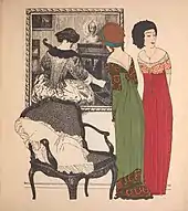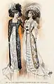 This decade marked the full flowering of Parisian haute couture as the arbiter of styles and silhouettes for women of all classes. Designers sent fashion models or mannequins to the Longchamp races wearing the latest styles,[8] and fashion photographs identified the creators of individual gowns.[9] In 1908, a new silhouette emerged from Callot Soeurs, Vionnet at the house of Doucet, and most importantly, Paul Poiret.[10] The styles were variously called Merveilleuse, Directoire, and Empire after the fashions of the turn of the nineteenth century, which they resembled in their narrow skirts and raised waistlines.