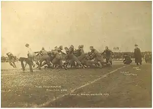 In the middle of the first half, a temporary bleacher at the northeast corner of the field collapsed, "carrying with it a mass of struggling people."[15] Several hundred people were thrown to the ground in the accident.[16][17] The Detroit Free Press described the scene following the collapse: "A shudder went through the grand stands, and the game was stopped. A score of men were injured, but no one were killed. The immense crowd about the gridiron took advantage of the confusion to break down the wire fence surrounding it, and hundreds swarmed onto the field. The few police were powerless to force them out, but the scrubs from both teams lined up against the crowd and shoved them away from the side lines so the game could be played."[15] The game was resumed after a 15-minute delay.