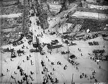 Political and business leaders strongly downplayed the effects of the earthquake, fearing loss of outside investment in the city which was badly needed to rebuild.[45] In his first public statement, California governor George Pardee emphasized the need to rebuild quickly: "This is not the first time that San Francisco has been destroyed by fire, I have not the slightest doubt that the City by the Golden Gate will be speedily rebuilt, and will, almost before we know it, resume her former great activity".[46] The earthquake itself is not even mentioned in the statement. Fatality and monetary damage estimates were manipulated.[47]