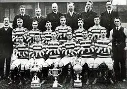 Celtic won the title ahead of Falkirk and Rangers. A 1–0 win at Rangers' home Ibrox in an Old Firm match on 25 April 1908 meant that they could not be caught by either pursuer. In the close season, the Celtic goalscorer Alec Bennett switched to Rangers, one of very few player moves directly between the rivals.[1]