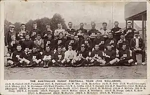 The 1908–09 Australia rugby union tour of the British Isles was a collection of friendly rugby union games undertaken by the Australia national rugby union team against invitational and national teams from England and Wales, as well as several games against sides from North America. This was the first Australian tour of the Northern Hemisphere and the side is sometimes referred to as the "First Wallabies".
