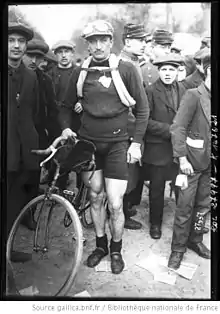 The race's fifth stage is considered to be the first real mountain stage in Giro d'Italia history.[4] The stage contained the climb of the Sestriere which rises over 2,000 meters.[4][8] As the race entered the Val Chisone leading up the Sestriere, the peloton ran into muddy roads, which forced many to walk their bikes.[4] Frenchman Lucien Petit-Breton led the riders up the slopes before cracking near the snowy summit.[4] He was passed first by Ezio Corlaita, who was the first to summit the Sestriere, and then by many other riders.[4][8] Petit-Breton caught up with the leading riders on the long descent and rode into the finish in Turin with Corlaita, Rossignoli, and Galetti.[4] Petit-Breton edged out Galetti for the stage win as Galetti tied Rossignoli for the overall lead.[4][9]